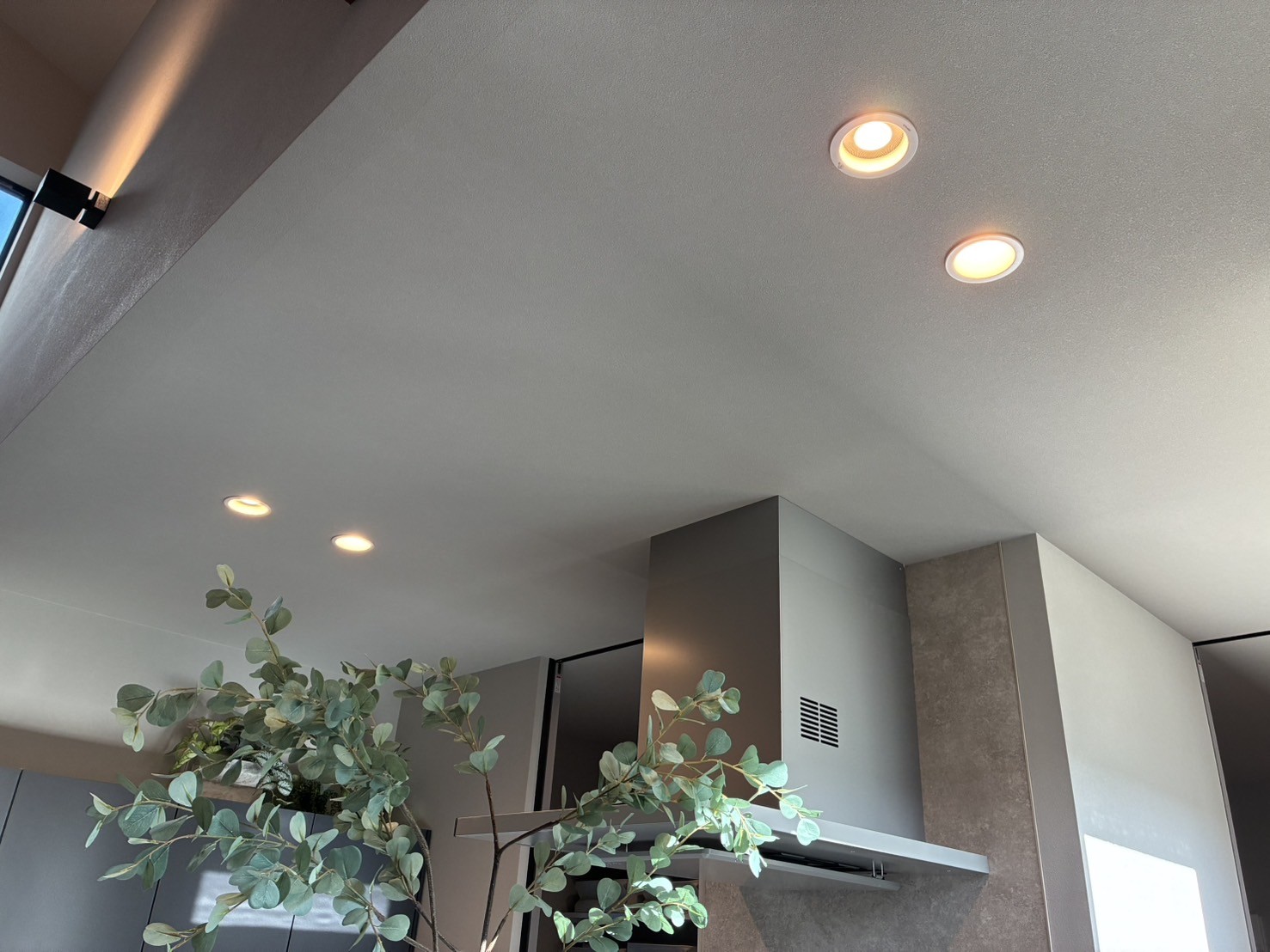 こちら一見何の変哲もないダウンライトですが、スピーカーが内蔵されており、bluetoothで音楽をつなげて心地の良いLDK空間にしております。