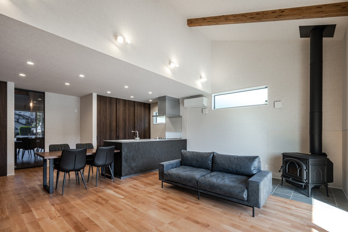 ・家の角に薪ストーブを配置し、家族が自然と集まる団らんスペース
